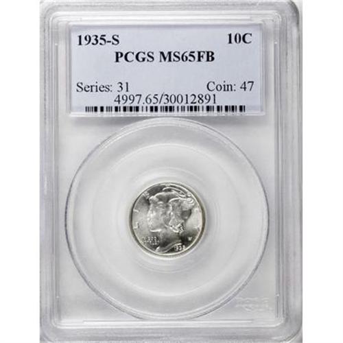 <B>1935-S 10C MS65 Full Bands PCGS.</B></I> PCGS Population (214/198). NGC Census: (47/91). Mintage: 15,840,000. Numismedia Wsl. Price for NGC/PCGS coin in MS65: $392. (#4997)<BR><BR><B>Coin Engraver:</B> Adolph A. Weinman<BR><BR><b>Shipping:</b> Coins & Currency (<a target="_blank" href="http://www.heritageauctions.com/common/shipping.php">view shipping information</a>)