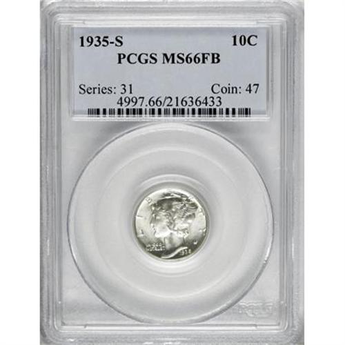 <B>1935-S 10C MS66 Full Bands PCGS.</B></I> . .. PCGS Population (123/73). NGC Census: (66/25). Mintage: 15,840,000. Numismedia Wsl. Price for NGC/PCGS coin in MS66: $525. (#4997)<BR><BR><B>Coin Engraver:</B> Adolph A. Weinman<BR><BR><b>Shipping:</b> Coins & Currency (<a target="_blank" href="http://www.heritageauctions.com/common/shipping.php">view shipping information</a>)