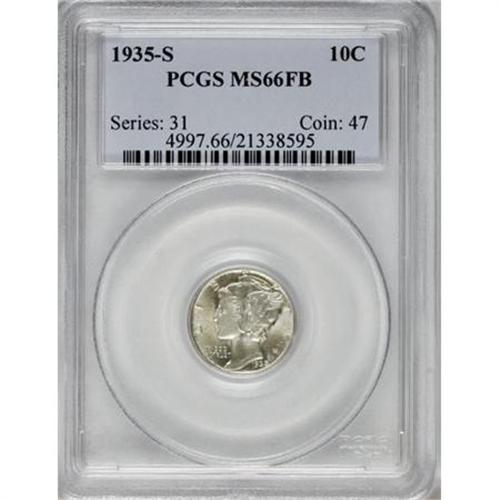 <B>1935-S 10C MS66 Full Bands PCGS.</B></I> PCGS Population (125/73). NGC Census: (66/26). Mintage: 15,840,000. Numismedia Wsl. Price for NGC/PCGS coin in MS66: $525. (#4997)<BR><BR><B>Coin Engraver:</B> Adolph A. Weinman<BR><BR><b>Shipping:</b> Coins & Currency (<a target="_blank" href="http://www.heritageauctions.com/common/shipping.php">view shipping information</a>)