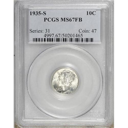 <B>1935-S 10C MS67 Full Bands PCGS.</B></I> PCGS Population (73/0). NGC Census: (25/0). Mintage: 15,840,000. Numismedia Wsl. Price for NGC/PCGS coin in MS67: $1,250. (#4997)<BR><BR><B>Coin Engraver:</B> Adolph A. Weinman<BR><BR><b>Shipping:</b> Coins & Currency (<a target="_blank" href="http://www.heritageauctions.com/common/shipping.php">view shipping information</a>)