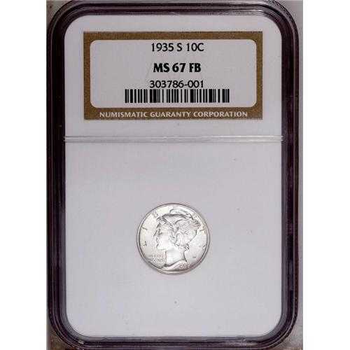 <B>1935-S 10C MS67 Full Bands NGC.</B></I> Since the otherwise common 1935-S is unknown in grades above the MS67 Full Bands level, the present example should be of obvious importance to quality conscious date collectors. The minimally patinated surfaces are satiny and nearly abrasion-free. The centers are fully brought up, but the peripheries are equally well defined and particularly noteworthy for a product of the San Francisco Mint. Census: 25 in 67, 0 finer (12/05).