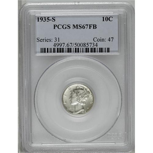 <B>1935-S<10C> MS67 Full Bands PCGS.</B></I> A blazing silver-white Mercury Dime, with satiny surfaces beaming with luster. The strike is dramatic, and hard to improve upon. Population: 62 in 67, 0 finer (2/06).