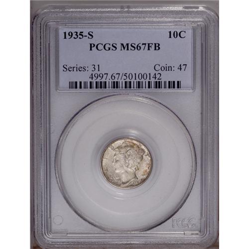 <B>1935-S<10C> MS67 Full Bands PCGS.</B></I> Splashes of orange-gold and honey color overlay pearl-gray iridescence. A well struck and nicely preserved representative, unavailable in higher grades with Full Bands at either major service. Population: 62 in 67, 0 finer (2/06).