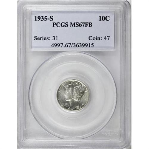 <B>1935-S 10C MS67 Full Bands PCGS.</B></I> A shining and sharply struck Superb Gem, essentially untoned save for a hint of gold in the subtly satiny fields. Marvelous visual appeal. Tied for the finest Full Bands example graded by PCGS (3/08).<BR><BR><B>Coin Engraver:</B> Adolph A. Weinman<BR><BR><b>Shipping:</b> Coins & Currency (<a target="_blank" href="http://www.heritageauctions.com/common/shipping.php">view shipping information</a>)