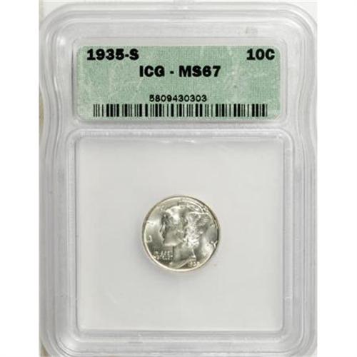 <B>1935-S 10C MS67 ICG.</B></I> NGC Census: (24/0). PCGS Population (21/1). Mintage: 15,840,000. Numismedia Wsl. Price for NGC/PCGS coin in MS67: $258. (#4996)<BR><BR><B>Coin Engraver:</B> Adolph A. Weinman<BR><BR><b>Shipping:</b> Coins & Currency (<a target="_blank" href="http://www.heritageauctions.com/common/shipping.php">view shipping information</a>)