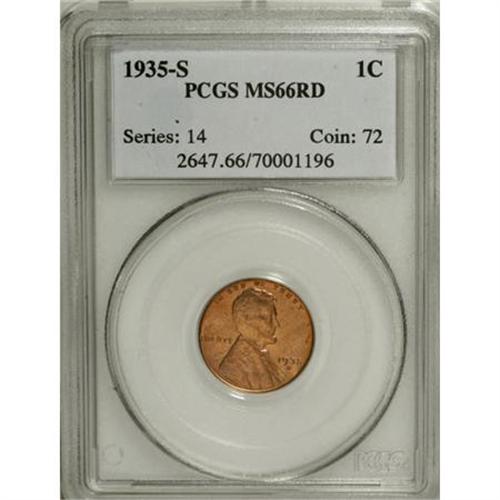 <B>1935-S 1C MS66 Red PCGS.</B></I> PCGS Population (214/6). NGC Census: (246/44). Mintage: 38,702,000. Numismedia Wsl. Price for NGC/PCGS coin in MS66: $92. (#2647)<BR><BR><B>Coin Engraver:</B> Victor D. Brenner<BR><BR><b>Shipping:</b> Coins & Currency (<a target="_blank" href="http://www.heritageauctions.com/common/shipping.php">view shipping information</a>\)