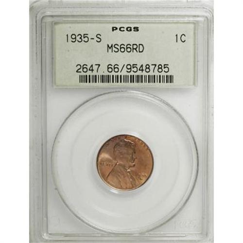 <B>1935-S 1C MS66 Red PCGS.</B></I> . PCGS Population (229/7). NGC Census: (248/43). Mintage: 38,702,000. Numismedia Wsl. Price for NGC/PCGS coin in MS66: $140. (#2647)<BR><BR><B>Coin Engraver:</B> Victor D. Brenner<BR><BR><b>Shipping:</b> Coins & Currency (<a target="_blank" href="http://www.heritageauctions.com/common/shipping.php">view shipping information</a>)