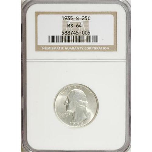 <B>1935-S 25C MS64 NGC.</B></I> . NGC Census: (264/401). PCGS Population (544/602). Mintage: 5,660,000. Numismedia Wsl. Price for NGC/PCGS coin in MS64: $130. (#5799)<BR><BR><B>Coin Engraver:</B> John Flanagan<BR><BR><b>Shipping:</b> Coins & Currency (<a target="_blank" href="http://www.heritageauctions.com/common/shipping.php">view shipping information</a>)