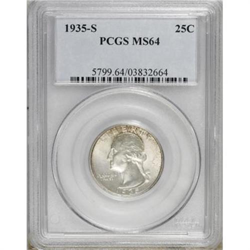 <B>1935-S 25C MS64 PCGS.</B></I> PCGS Population (542/597). NGC Census: (263/397). Mintage: 5,660,000. Numismedia Wsl. Price for NGC/PCGS coin in MS64: $120. (#5799)<BR><BR><B>Coin Engraver:</B> John Flanagan<BR><BR><b>Shipping:</b> Coins & Currency (<a target="_blank" href="http://www.heritageauctions.com/common/shipping.php">view shipping information</a>)