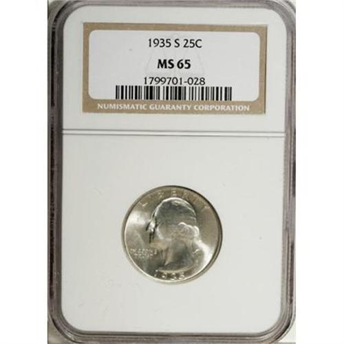<B>1935-S 25C MS65 NGC.</B></I> NGC Census: (246/147). PCGS Population (388/206). Mintage: 5,660,000. Numismedia Wsl. Price for NGC/PCGS coin in MS65: $240. (#5799)<BR><BR><B>Coin Engraver:</B> John Flanagan<BR><BR><b>Shipping:</b> Coins & Currency (<a target="_blank" href="http://www.heritageauctions.com/common/shipping.php">view shipping information</a>)