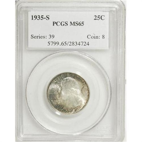 <B>1935-S 25C MS65 PCGS.</B></I> PCGS Population (386/205). NGC Census: (246/147). Mintage: 5,660,000. Numismedia Wsl. Price for NGC/PCGS coin in MS65: $240. (#5799)<BR><BR><B>Coin Engraver:</B> John Flanagan<BR><BR><b>Shipping:</b> Coins & Currency (<a target="_blank" href="http://www.heritageauctions.com/common/shipping.php">view shipping information</a>)