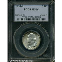 1935-S 25C MS66 PCGS. Golden-brown and sea-green p <B>1935-S 25C MS66 PCGS.</B></I> Golden-brown and sea-green patina enriches the margins of this lustrous, sharply struck, and lovingly preserved premium Gem. Worthy of a generous bid. Population: 150 in 66, 13 finer (10/04). <BR><BR><B>Important notice:</B> Heritage usually auctions material at the rate of 200-250 lots per hour. On some occasions eBay Live bid software or the Internet may not be able to keep up with the pace of the auction. We recommend placing a realistic absentee bid now as insurance to avoid disappointment. Occasionally the auctioneer may eliminate or reject an eBay Live bid, and the auctioneer may also reopen a lot after the close of the eBay live bidding (usually because we missed an audience bid), and may reject your bid even if it shows you as the winning bidder. By bidding via eBay Live, you agree that Heritage may award the lot to another bidder at its sole discretion under the circumstances described above or any other reasonable circumstances. Since eBay bids are not shown to us until we open the lot on the floor, we treat those bids just like floor bids. In most cases the floor responds before the eBay bid is presented to us, due to Internet lag time, so for consistency we have made it a policy that floor bids are always considered first over tie eBay live bids. Also please note that all Heritage lots purchased through eBay Live carry a 20% Buyer's Premium. Please make sure you read the Terms and Conditions before you bid. This lot is being auctioned in conjunction with a live floor auction by Heritage Galleries & Auctioneers. All final auction and invoice information will be supplied by Heritage Galleries & Auctioneers, and all other information should be considered preliminary. Lot:5998