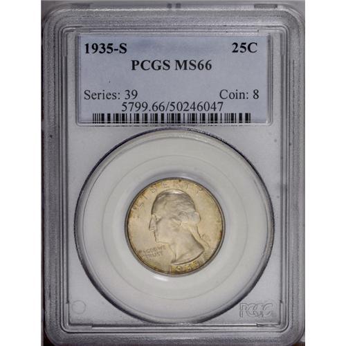<B>1935-S<25C> MS66 PCGS.</B></I> Golden-gray patination is imbued with whispers of light green and lilac along portions of the obverse periphery. Lustrous surfaces display well impressed motifs, and exhibit just a few inoffensive marks on Washington's cheek. PCGS has certified 15 coins finer (1/06).