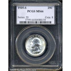 <TABLE cellSpacing=0 cellPadding=0 width="100%" bgColor=#000000 border=0><TBODY><TR><TD width="100%"><TABLE cellSpacing=1 cellPadding=3 width="100%" border=0><TBODY><TR><TD width="100%" bgColor=#79735c><FONT face=arial color=#ffffff size=3><B>Description</B> </FONT></TD></TR><TR><TD width="100%" bgColor=#ffffff><FONT face=arial size=2><B>1935-S 25C MS66 PCGS.</B></I> Well struck with bright, nearly brilliant surfaces. A few pastel orange toning patches appear on each side. There is a spidery lintmark (as struck) on the back of Washington's head, and a handful of pinpoint-sized contact marks rest on each side. Population: 95 in 66, 8 finer (8/03). </FONT></TD></TR></TBODY></TABLE></TD></TR></TBODY></TABLE><BR><A name=PricesRealized></A><TABLE cellSpacing=0 cellPadding=0 width="100%" bgColor=#000000 border=0><TBODY><TR><TD width="100%"><TABLE cellSpacing=1 cellPadding=3 width="100%" border=0><TBODY><TR><TD width="100%" bgColor=#79735c><A name=PR><FONT face=arial color=#ffffff size=3><B>Previous Prices from Heritage Auctions</B> </FONT></A></TD></TR><TR><TD bgColor=#f6f6ed><TABLE cellSpacing=0 cellPadding=0 width="100%" border=1><TBODY><TR><TD align=middle width="33%"><B>Date</B></TD><TD align=middle width="33%"><B>Service</B></TD><TD align=middle width="33%"><B>Price</B></TD></TR><TR bgColor=whitesmoke><TD width="33%"><B>12/31/2002</B></TD><TD width="33%">PCGS</TD><TD width="33%">$690.00</TD></TR><TR bgColor=whitesmoke><TD width="33%"><B>09/30/2002</B></TD><TD width="33%">PCGS</TD><TD width="33%">$718.75</TD></TR><TR bgColor=whitesmoke><TD width="33%"><B>04/05/2001</B></TD><TD width="33%">NGC</TD><TD width="33%">$184.00</TD></TR><TR bgColor=whitesmoke><TD width="33%"><B>08/08/1998</B></TD><TD width="33%">NGC</TD><TD width="33%">$330.00</TD></TR><TR bgColor=whitesmoke><TD width="33%"><B>01/20/1999</B></TD><TD width="33%">NGC</TD><TD width="33%">$196.00</TD></TR><TR bgColor=whitesmoke><TD width="33%"><B>09/18/2001</B></TD><TD width="33%">PCGS</TD><TD width="33%">$410.00</TD></TR><TR bgColor=whitesmoke><TD width="33%"><B>03/01/2003</B></TD><TD width="33%">PCGS</TD><TD width="33%">$4,140.00</TD></TR><TR bgColor=whitesmoke><TD width="33%"><B>07/29/2003</B></TD><TD width="33%">PCGS</TD><TD width="33%">$2,530.00</TD></TR><TR bgColor=whitesmoke><TD width="33%"><B>05/05/2003</B></TD><TD width="33%">NGC</TD><TD width="33%">$437.00</TD></TR><TR bgColor=whitesmoke><TD width="33%"><B>03/03/2003</B></TD><TD width="33%">NGC</TD><TD width="33%">$276.00</TD></TR><TR bgColor=whitesmoke><TD width="33%"><B>05/03/2003</B></TD><TD width="33%">NGC</TD><TD width="33%">$632.50</TD></TR></TBODY></TABLE></TD></TR><TR><TD bgColor=#ffffff><FONT face=arial size=1 ?>PLEASE NOTE: All prices realized reflect the final hammer price PLUS the buyer's premium in auctions that charge a buyer's premium. Each item has a notation at the top of the listing indicating whether that lot included a buyer's premium. Example: A item that sells with a final hammer price of $100 and a 20% buyer's premium will display with a price realized of $120. All information listed is intended to be as accurate as possible, but errors are possible. Please use this guide carefully and inform us of any inaccuracies. </FONT></TD></TR></TBODY></TABLE></TD></TR></TBODY></TABLE><BR><TABLE cellSpacing=0 cellPadding=0 width="100%" bgColor=#000000 border=0><TBODY><TR><TD width="100%"><TABLE cellSpacing=1 cellPadding=3 width="100%" border=0><TBODY><TR><TD width="100%" bgColor=#79735c colSpan=6><FONT face=arial color=#ffffff size=3><B>Price Guide*</B> </FONT></TD></TR><TR bgColor=#f6f6ed><TD align=middle><B>Grade</B> </TD><TD align=middle><B>Coin World<BR>(Trends)</B> </TD><TD align=middle><B>Numismedia<BR>Retail</B> </TD><TD align=middle><B>Numismedia<BR>Wholesale</B> </TD><TD align=middle><B>Coin<BR>Universe</B> </TD><TD align=middle><B>Heritage<BR>Value Index</B> </TD></TR><TR bgColor=#ffffff><TD align=middle>65</TD><TD align=right>---</TD><TD align=right>$250.00</TD><TD align=right>$200.00</TD><TD align=right>$375.00</TD><TD align=right>$280.00</TD></TR><TR style="FONT-WEIGHT: bold" bgColor=#cccfdd><TD align=middle>66</TD><TD align=right>---</TD><TD align=right>$530.00</TD><TD align=right>$424.00</TD><TD align=right>$700.00</TD><TD align=right>$1,107.50</TD></TR><TR bgColor=#ffffff><TD align=middle>67</TD><TD align=right>---</TD><TD align=right>---</TD><TD align=right>$775.00</TD><TD align=right>$12,000.00</TD><TD align=right>$8,400.00</TD></TR><TR bgColor=#ffffff><TD colSpan=6><FONT size=1>*All information listed is intended to be as accurate as possible, but errors are possible. No item may be returned or refused based on this information which is provided as a service to our customers. You should contact each pricing source directly to determine the accuracy of this information. </FONT></TD></TR></TBODY></TABLE></TD></TR></TBODY></TABLE><BR><TABLE cellSpacing=0 cellPadding=0 width="100%" bgColor=#000000 border=0><TBODY><TR><TD width="100%"><TABLE cellSpacing=1 cellPadding=3 width="100%" border=0><TBODY><TR><TD width="100%" bgColor=#79735c><FONT face=arial color=#ffffff size=3><B>Population Guide</B> </FONT></TD></TR><TR bgColor=#ffffff><TD align=middle><!-- Begin Output of Population Grid--><TABLE cellSpacing=0 cellPadding=0 width="100%" border=0><TBODY><TR><TD vAlign=center><TABLE cellSpacing=0 width="100%" border=1 cellsadding="3"><TBODY><TR><TD vAlign=center><TABLE cellSpacing=0 cellPadding=3 width="100%" border=1><TBODY><TR><TD vAlign=center align=middle bgColor=#f0f1e8 colSpan=2 <CENTER><FONT face=Arial size=2><B>PCGS Pop </B></FONT><CENTER></CENTER></TD><TD vAlign=center align=middle bgColor=#f0f1e8 colSpan=2><CENTER><FONT face=Arial size=2><B>NGC Pop</B></CENTER></FONT></TD></TR><TR><TD vAlign=center><FONT face=Arial size=2>(66)</FONT> </TD><TD vAlign=center align=right><FONT face=Arial size=2>95</FONT> </TD><TD vAlign=center><FONT face=Arial size=2>(66)</FONT> </TD><TD vAlign=center align=right><FONT face=Arial size=2>92</FONT> </TD></TR><TR><TD 