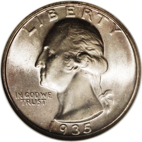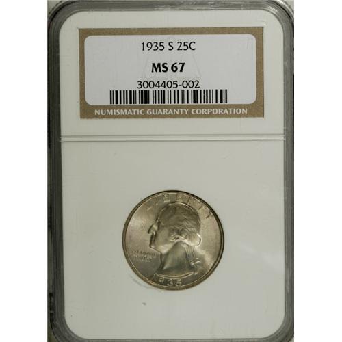 <B>1935-S 25C MS67 NGC.</B></I> Dappled olive-gold and pale plum enrich this lustrous, precisely struck, and exquisitely preserved Superb Gem. All 1935-dated quarters have Medium Mottos, but the reign was short-lived, since the Heavy Motto subtype took over in 1936. Census: 28 in 67, 0 finer (1/07).<BR><BR><b>Shipping:</b> Coins & Currency (<a target="_blank" href="http://www.heritageauctions.com/common/shipping.php">view shipping information</a>)