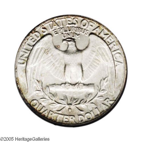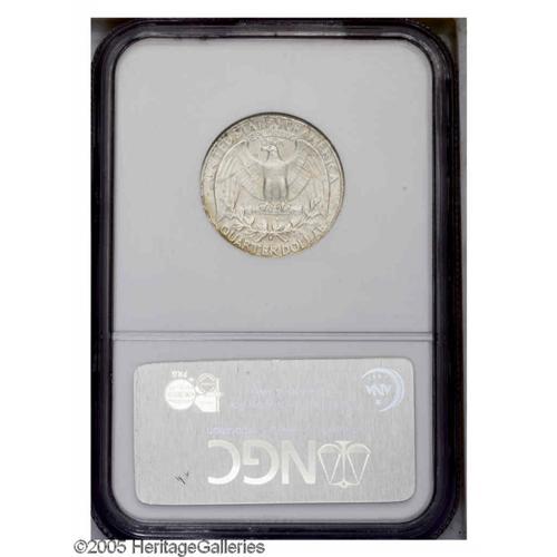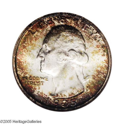 <B>1935-S<25C> MS67 NGC.</B></I> Splashes of ruby-red, gold, and sea-green color adorn the obverse margin, while the reverse is predominantly cream-gray. The luster is vibrant and the fields are splendidly preserved. A couple of ticks on the devices precludes perfection. This scarce early branch mint issue is unavailable any finer. Census: 24 in 67, none are finer (11/05).