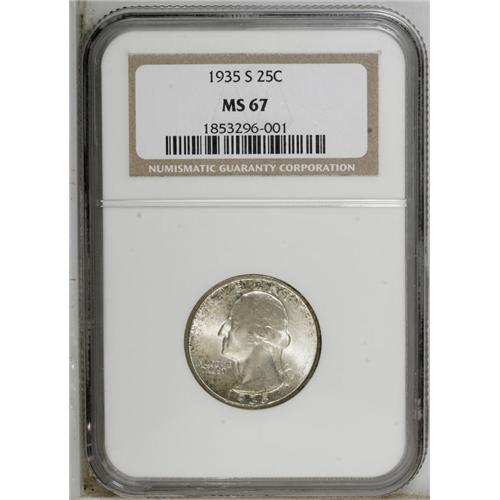 <B>1935-S 25C MS67 NGC.</B></I> The first of several Superb Gem examples offered, this impeccably smooth 1935-S is notable for its original, creamy-white surfaces outlined with speckled russet toning. Where else but a Heritage signature sale can the bidder choose between three representatives of unsurpassable quality? Census: 27 in 67, 0 finer (12/06).<BR><BR><b>Shipping:</b> Coin/Currency (<a target="_blank" href="http://www.heritageauctions.com/common/shipping.php">view shipping information</a>)