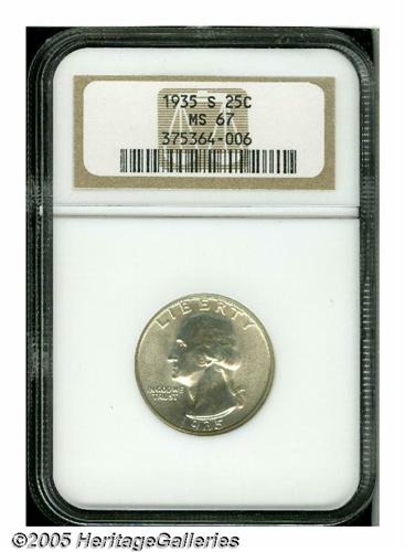 <B>1935-S<25C> MS67 NGC.</B></I> White, with lovely surfaces that exude satiny luster. Superb examples of this early S-mint are genuinely scarce. Population: 23 in 67, 0 finer (6/05).