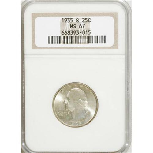 <B>1935-S 25C MS67 NGC.</B></I> Crisply struck with bold satin luster and faint streaks of gold patina on each side. The impressively preserved surfaces only reveal a couple of minuscule tick marks in Washington's hair, and are pristine otherwise. Census: 28 in 67, 0 finer (10/07). <BR><BR><B>Coin Engraver:</B> John Flanagan<BR><BR><b>Shipping:</b> Coins & Currency (<a target="_blank" href="http://www.heritageauctions.com/common/shipping.php">view shipping information</a>)
