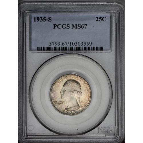 <B>1935-S<25C> MS67 PCGS.</B></I> A quick glance at this Superb 1935-S Washington and one knows they are looking at something special. In addition to the coin's radiant luster, the near-perfect surfaces are framed in reddish-lilac and golden toning that generates exceptional eye appeal. Population: 17 in 67, none are finer at either service (3/06).