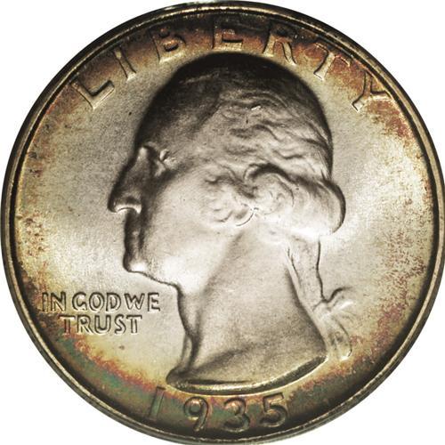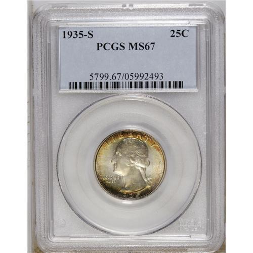 <B>1935-S 25C MS67 PCGS.</B></I> Dazzling luster radiates from impeccably preserved surfaces that display whispers of cobalt-blue, crimson, and orange-gold toning around portions of the rims. Delicate champagne and light blue occur in the centers of both sides. Good definition is seen on the design features. Population: 18 in 67, 0 finer (11/06).<BR><BR><b>Shipping:</b> Coin/Currency (<a target="_blank" href="http://www.heritageauctions.com/common/shipping.php">view shipping information</a>)