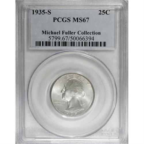 <B>1935-S 25C MS67 PCGS.</B></I> Billowy mint luster shines forth from both sides in the virtual absence of abrasions. The otherwise silver tinged iridescence yields to golden-tan patina in a few areas toward the central reverse. Well struck with exceptional eye appeal. With only 20 examples graded MS67 at PCGS and none finer (10/07), this '35-S is sure to elicit strong bids from Washington quarter enthusiasts.<BR><I>From The Michael Fuller Collection.</B></I><BR><BR><B>Coin Engraver:</B> John Flanagan<BR><BR><b>Shipping:</b> Coins & Currency (<a target="_blank" href="http://www.heritageauctions.com/common/shipping.php">view shipping information</a>)