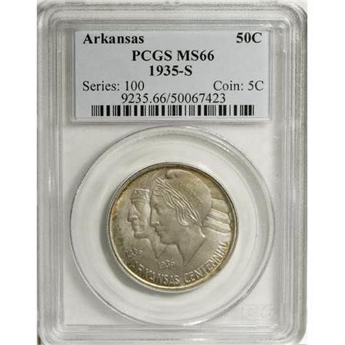 <B>1935-S 50C Arkansas MS66 PCGS.</B></I> PCGS Population (165/17). NGC Census: (84/13). Mintage: 5,506. Numismedia Wsl. Price for NGC/PCGS coin in MS66: $650. (#9235)<BR><BR><b>Shipping:</b> Coins & Currency (<a target="_blank" href="http://www.heritageauctions.com/common/shipping.php">view shipping information</a>)