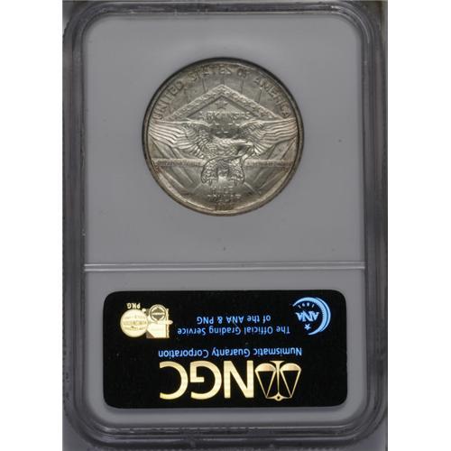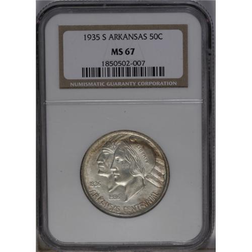 <B>1935-S<50C> Arkansas MS67 NGC.</B></I> Well struck with pearl-beige color that yields to speckled reddish-tan patina near some of the border areas. Smooth, unmarred surfaces that are near-pristine, save for a bit of insignificant chatter on Liberty's cheekbone. A conditionally rare Superb Gem. Census: 12 in 67, 0 finer (5/06).