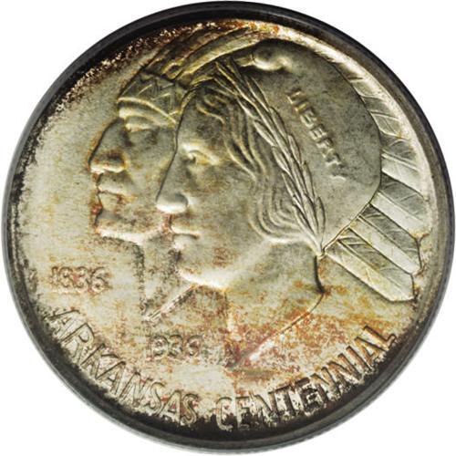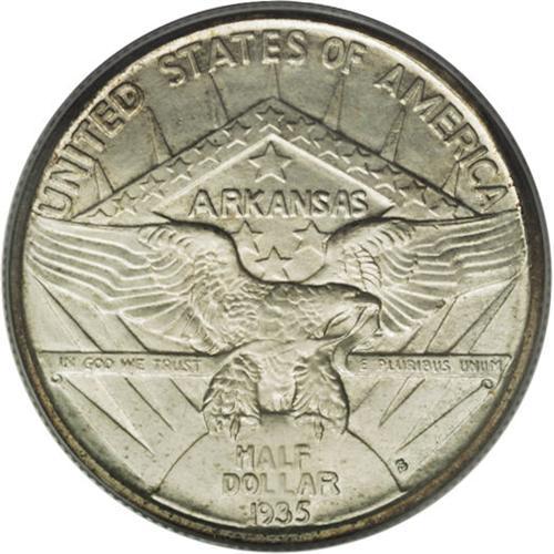 <B>1935-S 50C Arkansas MS67 PCGS.</B></I> While other commemorative series began with isolated issues and moved to three-coin sets, the Arkansas distributors followed the lead of Texas and began with coins from Philadelphia, Denver, and San Francisco. This wonderful Superb Gem from the last mint displays smooth, satiny surfaces. The obverse is decorated with splashes of crimson, apricot, and mauve-brown patina. An outstanding piece of unsurpassed quality. Population: 17 in 67, 0 finer (3/07).<BR><I>From The Cary & Cheryl Porter Collection.</B></I><BR><BR><b>Shipping:</b> Coins & Currency (<a target="_blank" href="http://www.heritageauctions.com/common/shipping.php">view shipping information</a>)