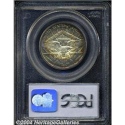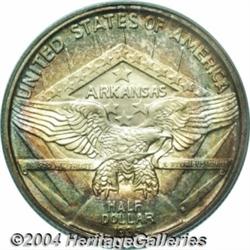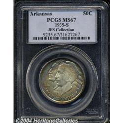 <B>1935-S<50C> Arkansas MS67 PCGS.</B></I> The centers are essentially untoned, while the peripheries have circular colorations of antique-gold, bright blue, and magenta patina. A well struck Superb Gem that has good luster and exquisite surfaces. 1935 was the first year of the Arkansas Centennial type, which was issued annually in PDS sets through 1939. The 1935-S had a mintage of just 5,506 pieces, with the extra six coins reserved for the Assay commission. Population: 14 in 67, none finer at either service (6/04).<BR><I>From the JFS Collection, the #1 All-Time PCGS Registry Set.</B></I> <BR><BR><B>Important notice:</B> Heritage usually auctions material at the rate of 200-250 lots per hour. On some occasions eBay Live bid software or the Internet may not be able to keep up with the pace of the auction. We recommend placing a realistic absentee bid now as insurance to avoid disappointment. Occasionally the auctioneer may eliminate or reject an eBay Live bid, and the auctioneer may also reopen a lot after the close of the eBay live bidding (usually because we missed an audience bid), and may reject your bid even if it shows you as the winning bidder. By bidding via eBay Live, you agree that Heritage may award the lot to another bidder at its sole discretion under the circumstances described above or any other reasonable circumstances. Since eBay bids are not shown to us until we open the lot on the floor, we treat those bids just like floor bids. In most cases the floor responds before the eBay bid is presented to us, due to Internet lag time, so for consistency we have made it a policy that floor bids are always considered first over tie eBay live bids. Also please note that all Heritage lots purchased through eBay Live carry a 20% Buyer's Premium. Please make sure you read the Terms and Conditions before you bid. </span></font></tr></table></td></tr></table>