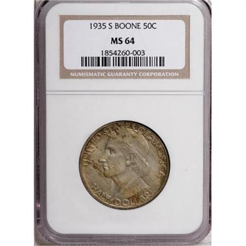 <B>1935-S 50C Boone MS64 NGC.</B></I> NGC Census: (161/514). PCGS Population (293/546). Mintage: 5,005. Numismedia Wsl. Price for NGC/PCGS coin in MS64: $160. (#9260)<BR><I>From The Frank DuVall Collection of U.S. Commemoratives.</B></I><BR><BR><b>Shipping:</b> Coins & Currency (<a target="_blank" href="http://www.heritageauctions.com/common/shipping.php">view shipping information</a>\)