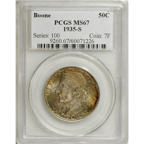 <B>1935-S 50C Boone MS67 PCGS.</B></I> Though the 1935/34-S garners more attention, with only 5,005 pieces coined, the 1935-S is a low-mintage issue in its own right. Dappled tan-gold and lilac-gray patina graces both sides of this carefully preserved and shining representative. Population: 16 in 67, 1 finer (3/07).<BR><I>From The Cary & Cheryl Porter Collection.</B></I><BR><BR><b>Shipping:</b> Coins & Currency (<a target="_blank" href="http://www.heritageauctions.com/common/shipping.php">view shipping information</a>)