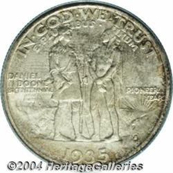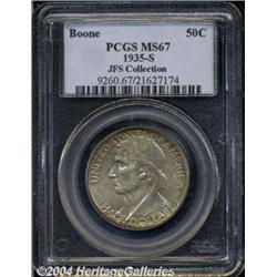 <B>1935-S<50C> Boone MS67 PCGS.</B></I> Just 5,005 examples of this issue were coined in each of the branch mints with double that number produced in Philadelphia. According to Walter Breen, the portrait of Daniel Boone on the obverse was taken from the frontispiece of Lewis Collins' <I>History of Kentucky.</B></I> Delightful pale gold toning over underlying frosty luster. Each side has peripheral iridescent toning. Population: 9 in 67, 1 finer (6/04).<BR><I>From the JFS Collection, the #1 All-Time PCGS Registry Set.</B></I> <BR><BR><B>Important notice:</B> Heritage usually auctions material at the rate of 200-250 lots per hour. On some occasions eBay Live bid software or the Internet may not be able to keep up with the pace of the auction. We recommend placing a realistic absentee bid now as insurance to avoid disappointment. Occasionally the auctioneer may eliminate or reject an eBay Live bid, and the auctioneer may also reopen a lot after the close of the eBay live bidding (usually because we missed an audience bid), and may reject your bid even if it shows you as the winning bidder. By bidding via eBay Live, you agree that Heritage may award the lot to another bidder at its sole discretion under the circumstances described above or any other reasonable circumstances. Since eBay bids are not shown to us until we open the lot on the floor, we treat those bids just like floor bids. In most cases the floor responds before the eBay bid is presented to us, due to Internet lag time, so for consistency we have made it a policy that floor bids are always considered first over tie eBay live bids. Also please note that all Heritage lots purchased through eBay Live carry a 20% Buyer's Premium. Please make sure you read the Terms and Conditions before you bid. </span></font></tr></table></td></tr></table>