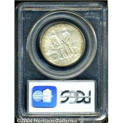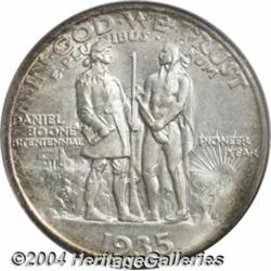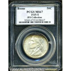 <B>1935-S<50C> Boone MS67 PCGS.</B></I> The borders display rich powder-blue, rose-violet, apple-green, and lemon colors, although the majority of this satiny Superb Gem features variegated cream-gray and lilac patina. Boldly struck, as is characteristic of this well made type, and a thorough perusal under a lens does not reveal any mentionable contact. Although the mintage of the 1935-S (5,005 pieces) is higher than that of the 1935/34-S (2,004 pieces), the former is nonetheless even scarcer at the MS67 level. Population: 11 in 67, 1 finer (3/04).<BR><I>Ex: Long Beach Signature Sale (Heritage, 6/04), lot 10082, which realized $3,335.</B></I><BR><I>From the JFS Collection, the #1 All-Time PCGS Registry Set.</B></I> <BR><BR><B>Important notice:</B> Heritage usually auctions material at the rate of 200-250 lots per hour. On some occasions eBay Live bid software or the Internet may not be able to keep up with the pace of the auction. We recommend placing a realistic absentee bid now as insurance to avoid disappointment. Occasionally the auctioneer may eliminate or reject an eBay Live bid, and the auctioneer may also reopen a lot after the close of the eBay live bidding (usually because we missed an audience bid), and may reject your bid even if it shows you as the winning bidder. By bidding via eBay Live, you agree that Heritage may award the lot to another bidder at its sole discretion under the circumstances described above or any other reasonable circumstances. Since eBay bids are not shown to us until we open the lot on the floor, we treat those bids just like floor bids. In most cases the floor responds before the eBay bid is presented to us, due to Internet lag time, so for consistency we have made it a policy that floor bids are always considered first over tie eBay live bids. Also please note that all Heritage lots purchased through eBay Live carry a 20% Buyer's Premium. Please make sure you read the Terms and Conditions before you bid. </span></font></tr></table></td></tr></table>