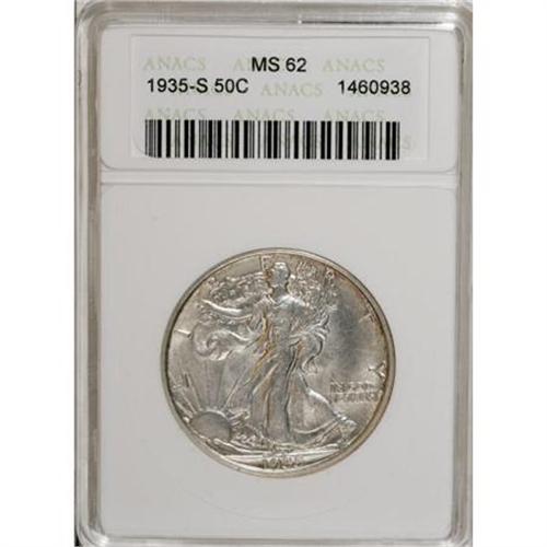 <B>1935-S 50C MS62 ANACS.</B></I> . NGC Census: (36/568). PCGS Population (36/925). Mintage: 3,854,000. Numismedia Wsl. Price for NGC/PCGS coin in MS62: $246. (#6597)<BR><BR><B>Coin Engraver:</B> Adolph A. Weinman<BR><BR><b>Shipping:</b> Coins & Currency (<a target="_blank" href="http://www.heritageauctions.com/common/shipping.php">view shipping information</a>)