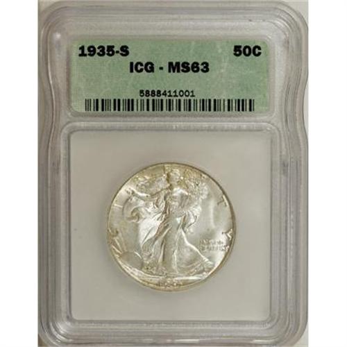 <B>1935-S 50C MS63 ICG.</B></I> NGC Census: (87/477). PCGS Population (140/761). Mintage: 3,854,000. Numismedia Wsl. Price for NGC/PCGS coin in MS63: $325. (#6597)<BR><BR><B>Coin Engraver:</B> Adolph A. Weinman<BR><BR><b>Shipping:</b> Coins & Currency (<a target="_blank" href="http://www.heritageauctions.com/common/shipping.php">view shipping information</a>)