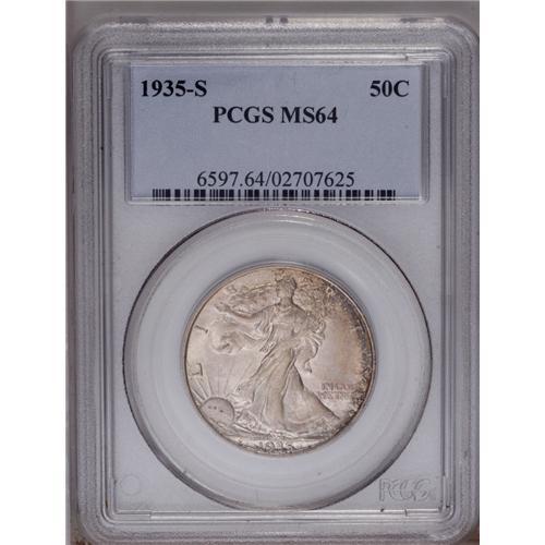 <B>1935-S<50C> MS64 PCGS.</B></I> Softly struck in the centers with rich luster and lovely original toning. Steel-blue, peach, and speckled sea-green colors are seen on each side. The surface preservation is outstanding for a near-Gem.