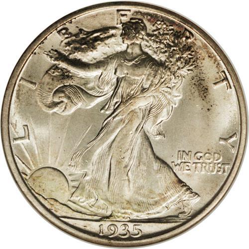 <B>1935-S 50C MS65 NGC.</B></I> Sky-blue and tawny-gold shades enrich the margins of this thoroughly lustrous S-mint Walker. The highpoints have suitable definition, and the eye appeal is formidable. The reverse is essentially free from contact, and obverse marks are also minimal.<BR><BR><b>Shipping:</b> Coin/Currency (<a target="_blank" href="http://www.heritageauctions.com/common/shipping.php">view shipping information</a>)