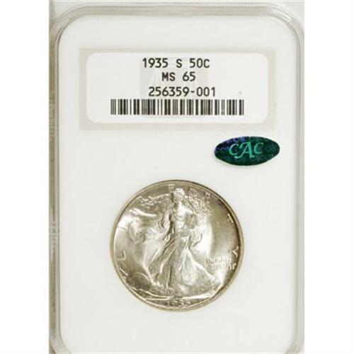 <B>1935-S 50C MS65 NGC. CAC.</B></I> Well struck with soft, swirling luster. This Depression-era S-mint piece shows just a hint of golden-tan toning at the lower obverse and reverse margins. NGC has graded 42 finer pieces (1/08).<BR><BR><B>Coin Engraver:</B> Adolph A. Weinman<BR><BR><b>Shipping:</b> Coins & Currency (<a target="_blank" href="http://www.heritageauctions.com/common/shipping.php">view shipping information</a>)