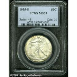 1935-S 50C MS65 PCGS. A high-end, satiny specimen <B>1935-S 50C MS65 PCGS.</B></I> A high-end, satiny specimen with hardly a blemish to be found on either obverse or reverse. Additionally, the strike on this scarcer mintmarked issue is virtually full and noticeably sharper than the typical '35-S. <BR><BR><B>Important notice:</B> Heritage usually auctions material at the rate of 200-250 lots per hour. On some occasions eBay Live bid software or the Internet may not be able to keep up with the pace of the auction. We recommend placing a realistic absentee bid now as insurance to avoid disappointment. Occasionally the auctioneer may eliminate or reject an eBay Live bid, and the auctioneer may also reopen a lot after the close of the eBay live bidding (usually because we missed an audience bid), and may reject your bid even if it shows you as the winning bidder. By bidding via eBay Live, you agree that Heritage may award the lot to another bidder at its sole discretion under the circumstances described above or any other reasonable circumstances. Since eBay bids are not shown to us until we open the lot on the floor, we treat those bids just like floor bids. In most cases the floor responds before the eBay bid is presented to us, due to Internet lag time, so for consistency we have made it a policy that floor bids are always considered first over tie eBay live bids. Also please note that all Heritage lots purchased through eBay Live carry a 20% Buyer's Premium. Please make sure you read the Terms and Conditions before you bid. This lot is being auctioned in conjunction with a live floor auction by Heritage Galleries & Auctioneers. All final auction and invoice information will be supplied by Heritage Galleries & Auctioneers, and all other information should be considered preliminary. Lot:6183