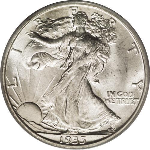 <B>1935-S 50C MS65 PCGS.</B></I> Just a hint of soft golden patina graces the frosty and otherwise untoned surfaces. Though Liberty's branch hand displays only slight definition, the level of detail visible on her head and skirt establishes the strike as above-average for this often-weak issue. While an abrasion between two rays of the sun precludes a higher grade, the overall visual appeal is strong for this pleasing example.<BR><BR><b>Shipping:</b> Coins & Currency (<a target="_blank" href="http://www.heritageauctions.com/common/shipping.php">view shipping information</a>)