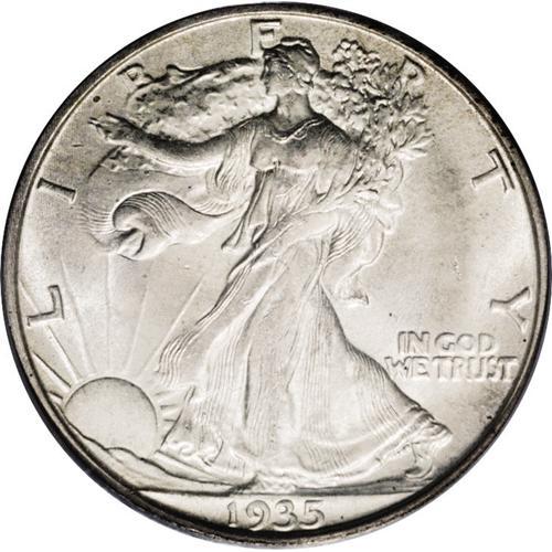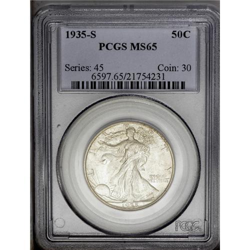 <B>1935-S<50C> MS65 PCGS.</B></I> Nicely struck for this more challenging S-mint from the mid 1930s, with a thin veil of milky silver-gray patina over both sides. A small reeding mark at the center of the obverse can be used for attribution. <BR><BR><B>Important notice:</B> Heritage usually auctions material at the rate of 200-250 lots per hour. On some occasions eBay Live bid software or the Internet may not be able to keep up with the pace of the auction. We recommend placing a realistic absentee bid now as insurance to avoid disappointment. Occasionally the auctioneer may eliminate or reject an eBay Live bid, and the auctioneer may also reopen a lot after the close of the eBay live bidding (usually because we missed an audience bid), and may reject your bid even if it shows you as the winning bidder. By bidding via eBay Live, you agree that Heritage may award the lot to another bidder at its sole discretion under the circumstances described above or any other reasonable circumstances. Since eBay bids are not shown to us until we open the lot on the floor, we treat those bids just like floor bids. In most cases the floor responds before the eBay bid is presented to us, due to Internet lag time, so for consistency we have made it a policy that floor bids are always considered first over tie eBay live bids. Also please note that all Heritage lots purchased through eBay Live carry a 20% Buyer's Premium. Please make sure you read the Terms and Conditions before you bid. This lot is being auctioned in conjunction with a live floor auction by Heritage Galleries & Auctioneers. All final auction and invoice information will be supplied by Heritage Galleries & Auctioneers, and all other information should be considered preliminary. Lot:2951 <BR><BR><B>Winning Notification and Billing:</B> After the FINAL session in this auction is complete, Heritage will send e-mail and snail mail invoices. This process normally takes several days. All final auction and invoice information will be supplied by Heritage Galleries & Auctioneers, and all other information should be considered preliminary. <BR><BR>This auction will be conducted on a live auction floor and over the Internet through eBay Live. If you choose to place an absentee bid, please take a moment to <font color='#0000ff'><u><a href='http://pages.ebay.com/liveauctions/help/before/laabsentee.html'>learn how eBay Live absentee bidding works</a></u></font><font color='#000000'>