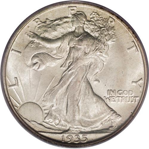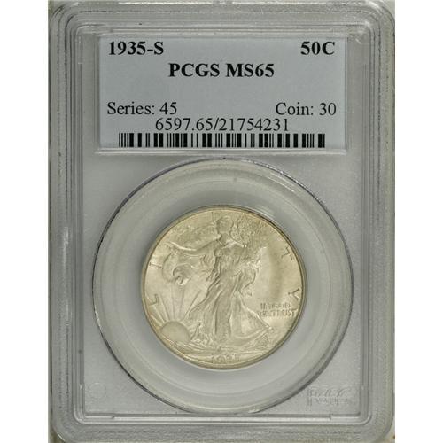 <B>1935-S 50C MS65 PCGS.</B></I> Nicely struck for this more challenging S-mint from the mid 1930s, with a thin veil of milky silver-gray patina over both sides. A small reeding mark at the center of the obverse can be used for identification. Although Gem MS65 grade pieces are not particularly rare, higher quality examples are elusive.<BR><BR><b>Shipping:</b> Coin/Currency (<a target="_blank" href="http://www.heritageauctions.com/common/shipping.php">view shipping information</a>)