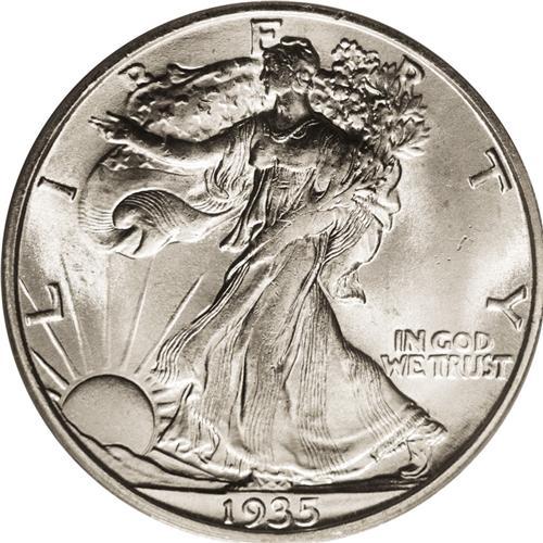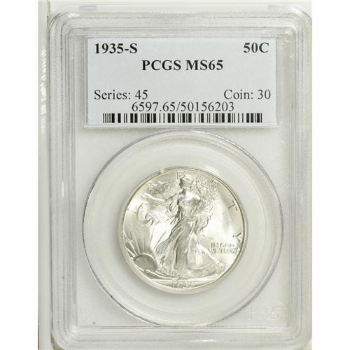 <B>1935-S 50C MS65 PCGS.</B></I> Hardly a blemish can be found on either obverse or reverse of this high-end, satiny representative. The luster is bold and radiant over the untoned silver-white surfaces. The strike on this scarcer mintmarked issue is virtually full and noticeably sharper than the typical 1935-S. An appealing Gem.<BR><BR><b>Shipping:</b> Coin/Currency (<a target="_blank" href="http://www.heritageauctions.com/common/shipping.php">view shipping information</a>)