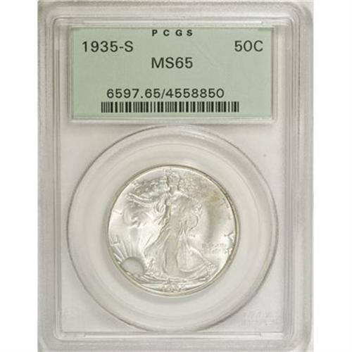 <B>1935-S 50C MS65 PCGS.</B></I> Dashes of lemon and apricot toning visit the upper left reverse, and blushes of light tan grace the right obverse and the left half of the eagle. Crisply struck aside from the branch hand and upper skirt lines. Lustrous, well preserved, and encased in a green label holder.<BR><BR><b>Shipping:</b> Coins & Currency (<a target="_blank" href="http://www.heritageauctions.com/common/shipping.php">view shipping information</a>)