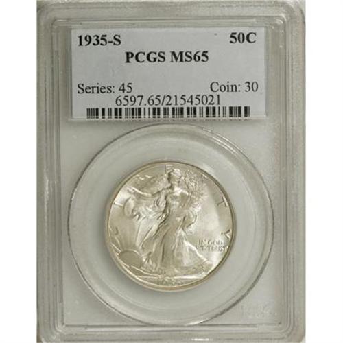 <B>1935-S 50C MS65 PCGS.</B></I> The 1935-S is relatively scarce in MS64 and higher, with fully struck devices (Bruce Fox, 1993). The Gem we offer in this lot has sharply defined gown lines, but exhibits the usual softness in the centers. Silver-gray surfaces display pleasing luster, and a few minor obverse handling marks are in line with the grade designation.<BR><I>From The Mario Eller Collection, Part One.</B></I><BR><BR><B>Coin Engraver:</B> Adolph A. Weinman<BR><BR><b>Shipping:</b> Coins & Currency (<a target="_blank" href="http://www.heritageauctions.com/common/shipping.php">view shipping information</a>)