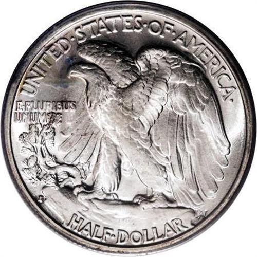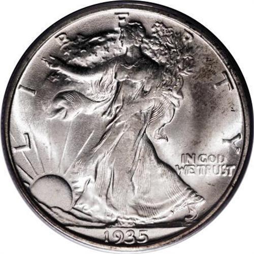 <B>1935-S 50C MS65 PCGS.</B></I> Dashes of lemon and apricot toning visit the upper left reverse, and blushes of light tan grace the right obverse and the left half of the eagle. Crisply struck aside from the branch hand and upper skirt lines. Lustrous, well preserved, and encased in a green label holder.<BR><BR><B>Coin Engraver:</B> Adolph A. Weinman<BR><BR><b>Shipping:</b> Coins & Currency (<a target="_blank" href="http://www.heritageauctions.com/common/shipping.php">view shipping information</a>)
