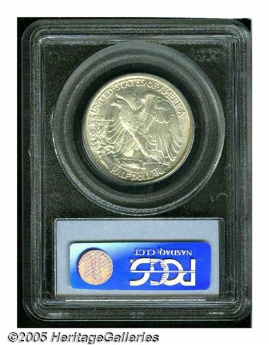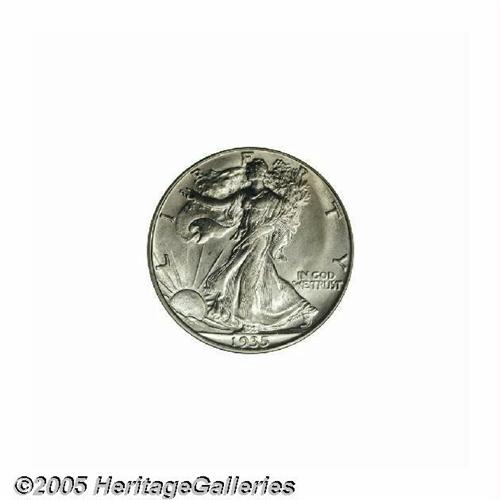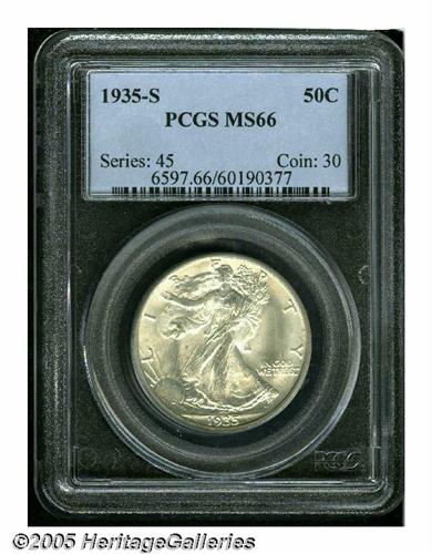 <B>1935-S<50C> MS66 PCGS.</B></I> This is a condition rarity that is relatively available in lower quality, but elusive in Gem preservation. This one is brilliant and lustrous, and it has frosty silver surfaces. Although the thumb is not completely outlined, it does show separation. Other details are generally boldly defined. Population: 72 in 66, 2 finer (6/05).<BR><I>From The Robert Moreno Collection.</B></I>