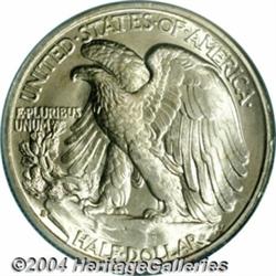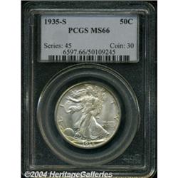 <B>1935-S<50C> MS66 PCGS.</B></I> In his <I>The Complete Guide to Walking Liberty Half Dollars,</B></I> Fox indicates this issue is relatively scarce in Mint State 64 and higher, fully struck. This Premium Gem is somewhat above average in strike, showing fairly strong, though not full, definition on the thumb of Liberty's left hand. Pleasing satiny surfaces emit a glow of soft luster beneath pale violet and powder-blue coloration with gold and green accents on the obverse, and a veil of faint golden-gray color on the reverse. A few barely noticeable marks in the right obverse field in no way detract from the overall quality of this attractive specimen. Population: 60 in 66, 2 finer (3/04). <BR><BR><B>Important notice:</B> Heritage usually auctions material at the rate of 200-250 lots per hour. On some occasions eBay Live bid software or the Internet may not be able to keep up with the pace of the auction. We recommend placing a realistic absentee bid now as insurance to avoid disappointment. Occasionally the auctioneer may eliminate or reject an eBay Live bid, and the auctioneer may also reopen a lot after the close of the eBay live bidding (usually because we missed an audience bid), and may reject your bid even if it shows you as the winning bidder. By bidding via eBay Live, you agree that Heritage may award the lot to another bidder at its sole discretion under the circumstances described above or any other reasonable circumstances. Since eBay bids are not shown to us until we open the lot on the floor, we treat those bids just like floor bids. In most cases the floor responds before the eBay bid is presented to us, due to Internet lag time, so for consistency we have made it a policy that floor bids are always considered first over tie eBay live bids. Also please note that all Heritage lots purchased through eBay Live carry a 20% Buyer's Premium. Please make sure you read the Terms and Conditions before you bid. </span></font></tr></table></td></tr></table>
