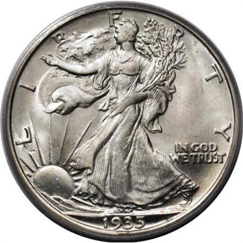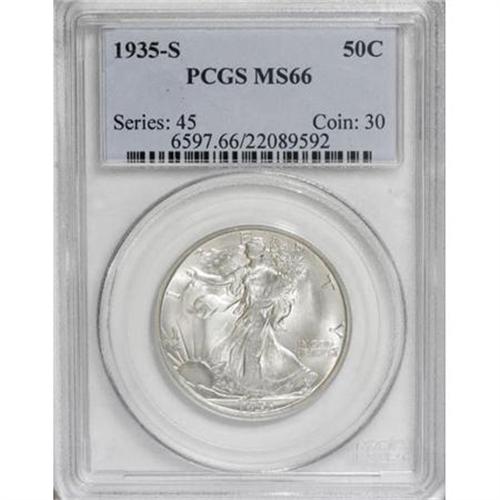 <B>1935-S 50C MS66 PCGS.</B></I> Pale gold and silver-blue toning endow this lovely Premium Gem. Scintillating luster sweeps nearly unabraded fields and devices. The branch hand shows blending of detail, but the strike is otherwise good. The combined forces of NGC and PCGS have certified just five pieces finer (6/07). <BR><BR><B>Coin Engraver:</B> Adolph A. Weinman<BR><BR><b>Shipping:</b> Coins & Currency (<a target="_blank" href="http://www.heritageauctions.com/common/shipping.php">view shipping information</a>\)
